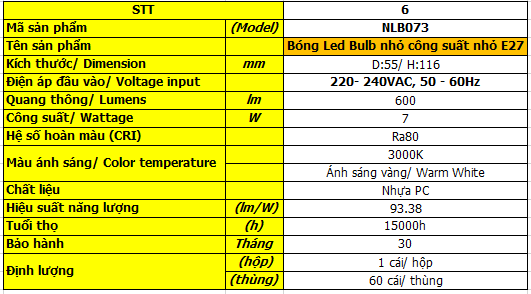 Bóng Đèn LED Bulb Công Suất Nhỏ NLB073 7W – Ánh Sáng Vàng