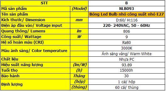 Bóng Đèn LED Bulb Công Suất Nhỏ NLB093 9W – Ánh Sáng Vàng