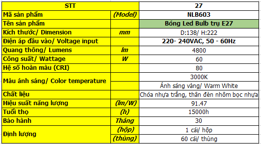 Bóng Đèn LED Bulb Trụ Công Suất Lớn NLB603 60W – Ánh Sáng Vàng Nanoco