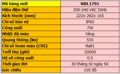 NBL1791 là dòng sản phẩm nổi bật trong xu hướng đèn trang trí 2019. Đèn có thể dùng trong nhà hay ngoài trời đều được vì có chỉ số IP65 chống thấm chống bụi tốt. Thiết kế đèn gần như truyền thống, từa tựa đèn ngủ, với thân đèn được thiết kế nhỏ gọn cùng với nắp chụp đem lại vẻ trang nhã cho ngôi nhà của bạn. Công suất chiếu sáng: 14W(2x7W)/AC200-240V-50Hz, quang thông 555lm cho khả năng chiếu sáng vừa phải. Chỉ số hoàn màu cao CRI cao lên đến 85 cho ra màu sắc trung thực nhất. Chất liệu làm từ nhôm đúc màu trắng bền đẹp theo thời gian.