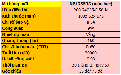 Thiết kế hình nón với 2 đầu sáng cho 2 luồng ánh sáng khác nhau làm nổi bật lên khung cảnh chiếu sáng cho một vẻ đẹp độc đáo. Công suất chiếu sáng: 9W/AC200-240V cho vùng chiếu sáng vừa phải đồng thời đảm bảo luồng chiếu sáng được xa hơn. Chất liệu thân đèn được làm băng nhôm đúc với màu trắng/bạc, NBL2553S tinh tế giúp kháng nước đảm bảo cho đèn hoạt động tốt ngoài trời.