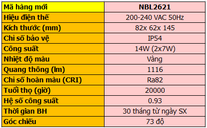 Thiết kế kiểu vuông cho khả năng chiết sáng 2 chiều đối xứng cùng với khả năng tỏa sáng theo hình nón. Công suất chiếu sáng: 5W/AC200-240V cho vùng chiếu sáng vừa phải. Thân đèn được làm từ nhôm đúc màu xám nhạt giúp đèn ẩn trong bóng tối làm nổi bật góc chiếu. IP54 cho phép đèn chống bụi và nước tốt. Đèn có 2 màu sắc ánh sáng vàng và trắng, trọng lượng chưa đến 0,5kg, tiện di chuyển, tháo lắp.