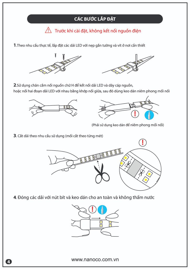 Bạn có thể tham khảo các bước lắp đặt đèn LED dây theo sơ đồ dưới đây