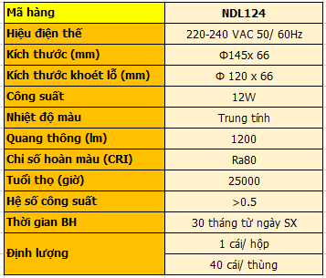 Đèn LED Downlight Dày 12W NDL124 Ánh Sáng Trung Tính – Angel 90°