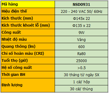 Đèn LED Slim Downlight 9W NSD0931 Ánh Sáng Vàng – Angel 120° Nanoco