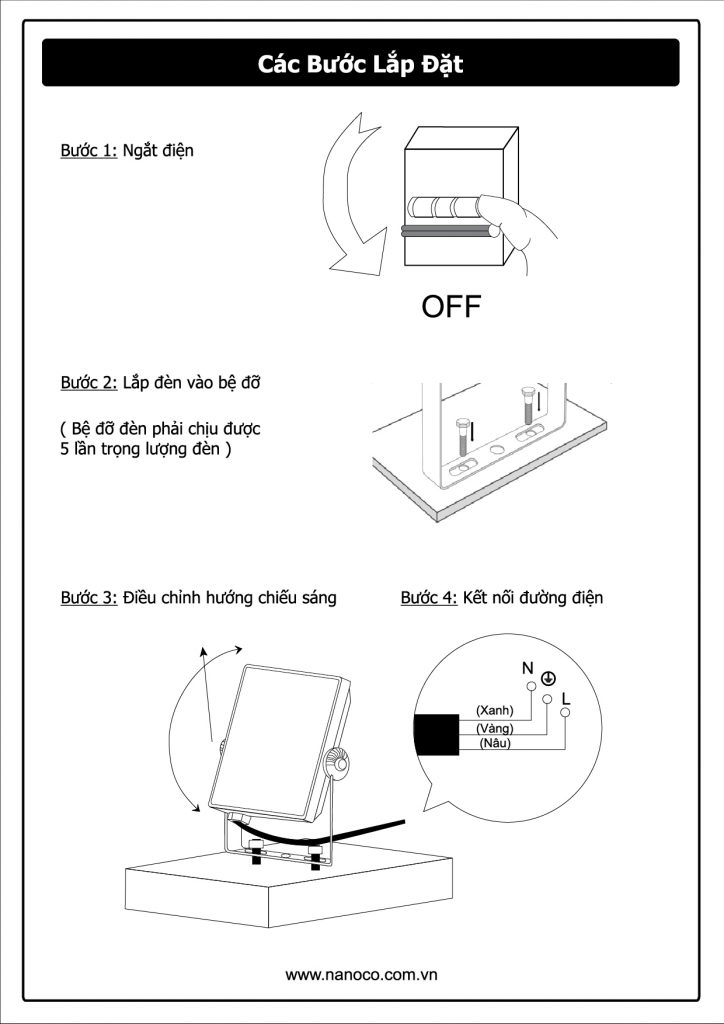 Bước 3: Đèn pha floodlight Nanoco phải được lắp đặt phù hợp với quy định dây điện IEC hiện hành và các quy định xây dựng bởi một thợ điện đủ tiêu chuẩn. Sử dụng ít nhất H05RN-F 3×1.0mm2 hoặc các đặc điểm kỹ thuật (không được cung cấp) là cáp ngoài trời, cáp vỏ cao su. Cáp phải có diện tích mặt cắt tối thiểu là 1,0mm2